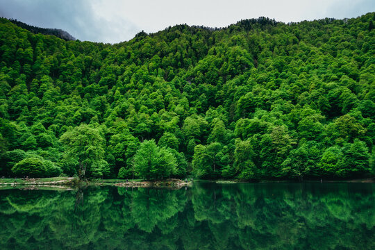 Tranquil lake reflecting autumn foliage in peaceful forest