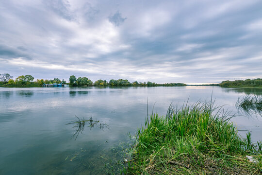 Stunning view of lake surrounded by green hills and mountains under cloudy sky