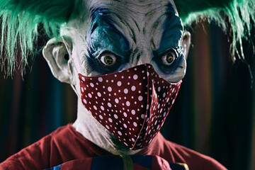Portrait of a scary clown peering from behind a wall. Halloween mask of fear. Clown horror poster