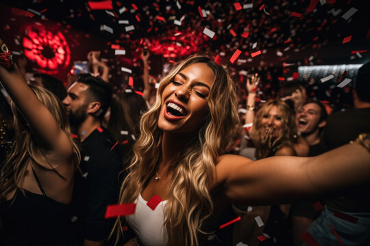 Dynamic scene of people dancing and celebrating at a party or club with confetti in the air and colorful lights in the background.