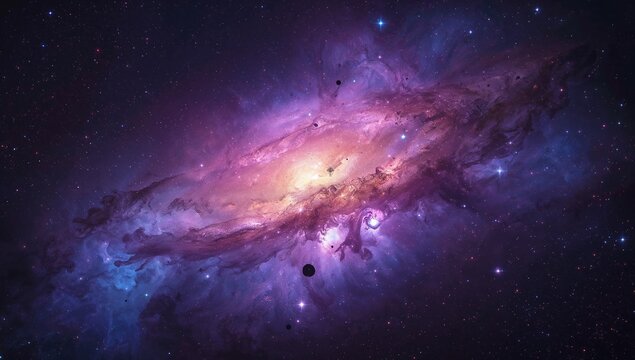 Stunning deep space nebula explosion with vibrant pink purple and yellow cosmic dust clouds illuminating countless distant stars and dark planets