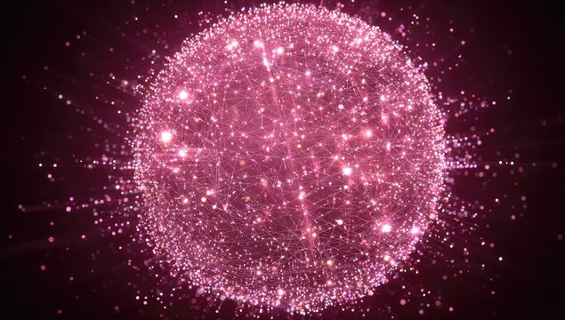 A glowing sphere, network of points, with lines, radiating light, in magenta on black