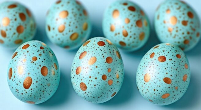 Seven light blue eggs with gold and brown speckled patterns arranged on a matching light blue background conveying a festive and delicate mood