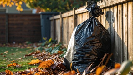 Garbage bag by the fence in the backyard, depicting waste disposal and outdoor clutter