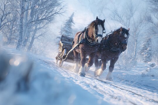 Horses Pulling Sleigh Through Snowy Winter Landscape