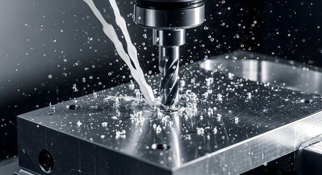 CNC milling machine cutting metal block with coolant spray, high precision machining process symbolizing technology, engineering, manufacturing, and industrial production