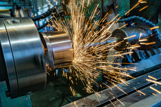 Grinding a cylindrical part on a circular grinding machine, high-precision abrasive grinding with sparks.