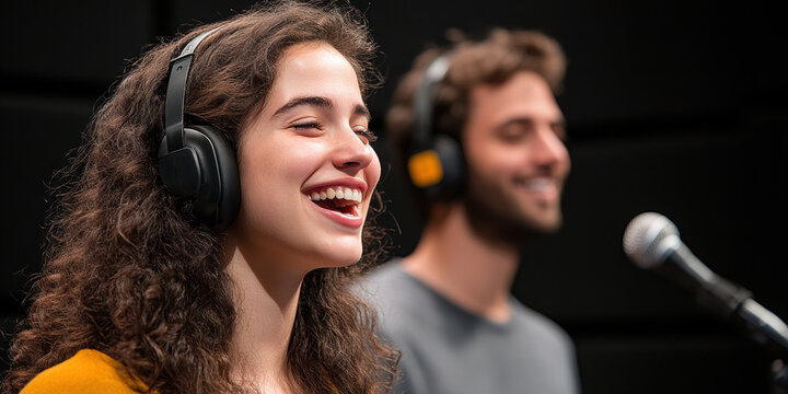 woman laughing while co hosting podcast, both wearing studio headphones and vibing to good conversation