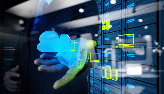 Futuristic data center corridor showing symmetrical server racks with blue and green leds