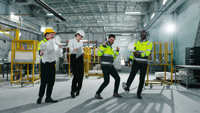 Diversion from work or serious matters on construction site. Managers in yellow vests are dancing and having fun at factory. Multicultural workers enjoy their work. Relaxation at workplace.