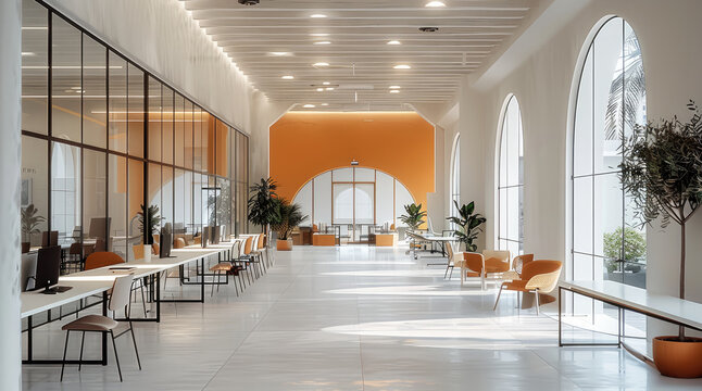 Bright co-working space with natural elements, ergonomic furniture, and ample natural light, fostering productivity