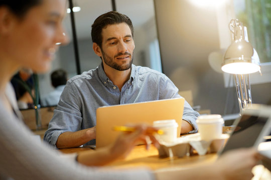 Smiling professional working on laptop in coworking space, collaboration and productivity