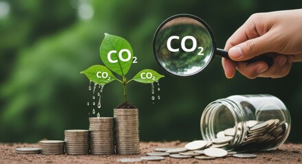 Plant growing on coins with CO2 text and magnifying glass carbon dioxide growth