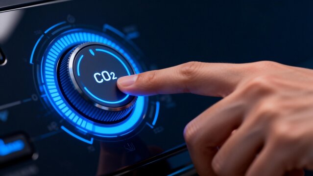 Hand adjusting a digital slider, showing CO2 reduction and a green leaf symbol