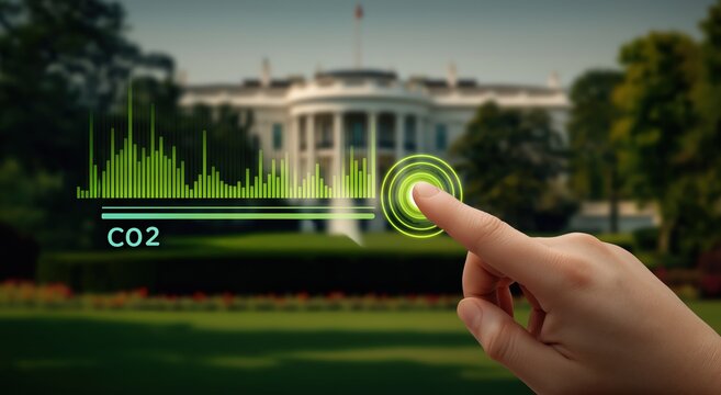 A hand touches a digital interface showing CO2 levels in front of a large building, symbolizing the intersection of technology and environmental awareness.