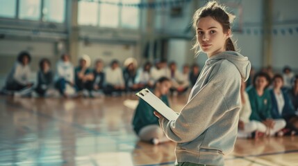 Sports coach observing students with digital tablet in basketball gym