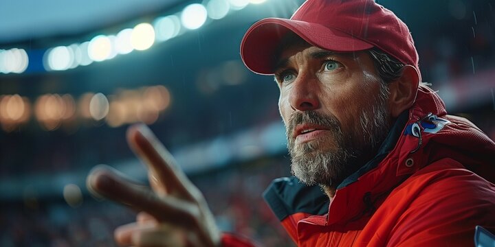 Passionate Coach Leading His Team Under Stadium Lights, generative ai