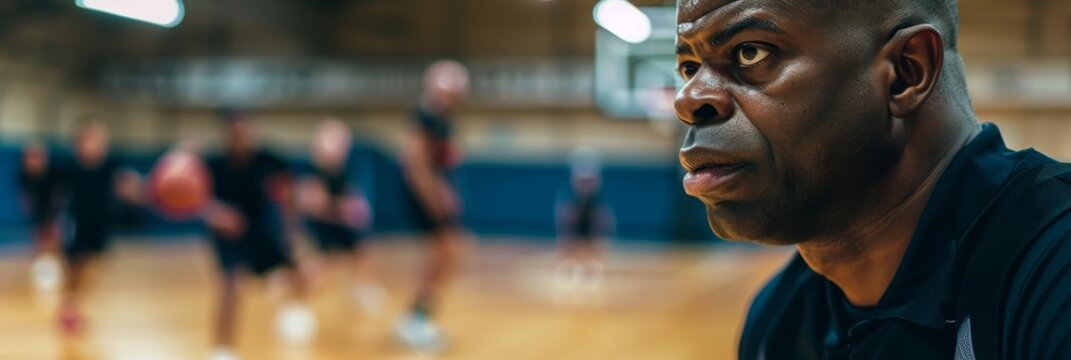 A basketball coach watches his team intently during a training session inside an indoor gym