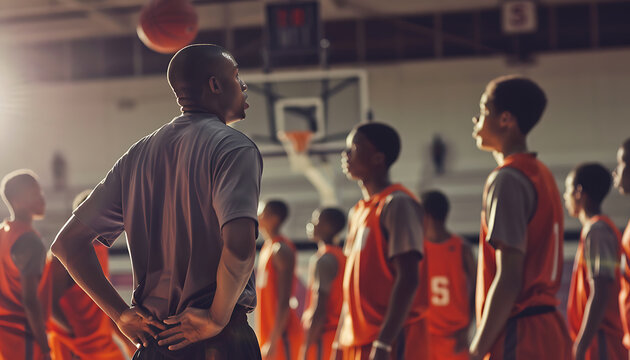 Outdoor basketball practice scene: A coach gives instructions to his team under the warm glow of sunset before their training session.