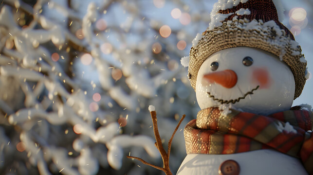 Festive snowman with red and green knit hat carrot nose coal eyes wooden buttons and evergreen accents on snowy surface with falling snowflakes and warm golden light for holiday editorial seasonal bra