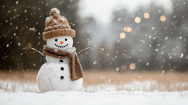 A charming snowman with a traditional top hat, scarf, and coal buttons standing in a snowy winter landscape.