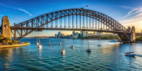 Majestic steel arches of iconic Australian landmark stretch across sparkling blue water, connecting city to harbor, under sunny cloudless sky with sailboats in foreground.