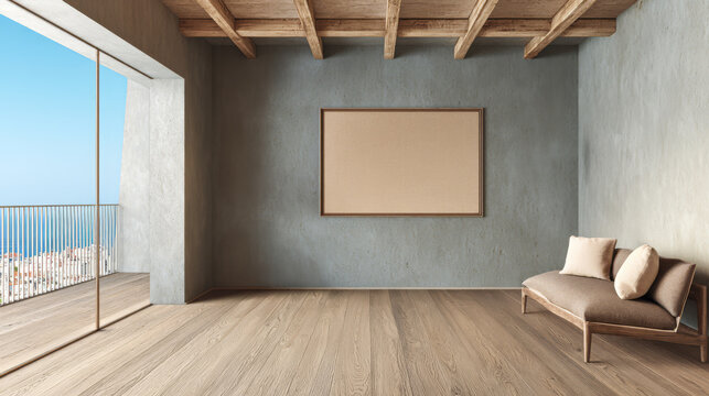 Modern minimalist interior with large blank canvas overlooking coastal view