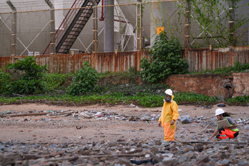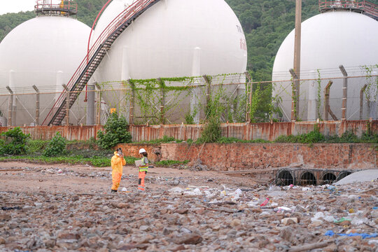 Two engineers, one in a yellow protective suit, inspect a coastal industrial site. They use a laptop and testing equipment on the beach near large gas storage tanks.