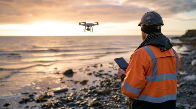 Solar-powered AI drones conducting environmental monitoring over a coastal ecosystem. Showcasing sustainable technology in action. Banner. Generative Ai content.