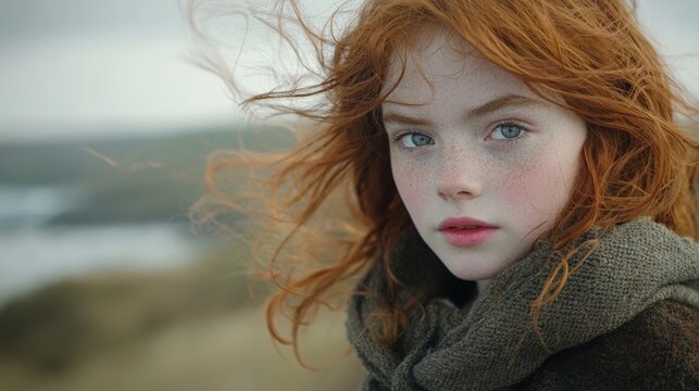 Captivating Portrait of a Young Redhead Girl in Windy Seaside Setting