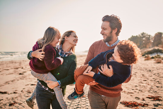 Joyful family sharing a moment on the beach at sunset