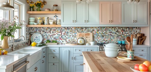 Bright coastal cottage kitchen with pastel cabinets, butcher-block countertops, and a colorful mosaic backsplash.