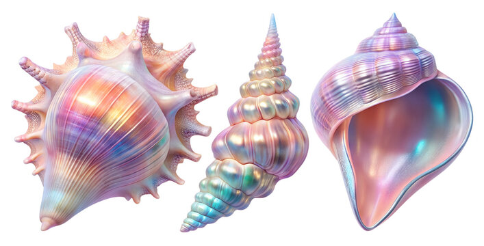 A set of holographic shells with bright shimmering glitter and fancy shapes. The shells are cut out and isolated on a transparent background. Iridescent shell gradient in blue and pink pastel shades.