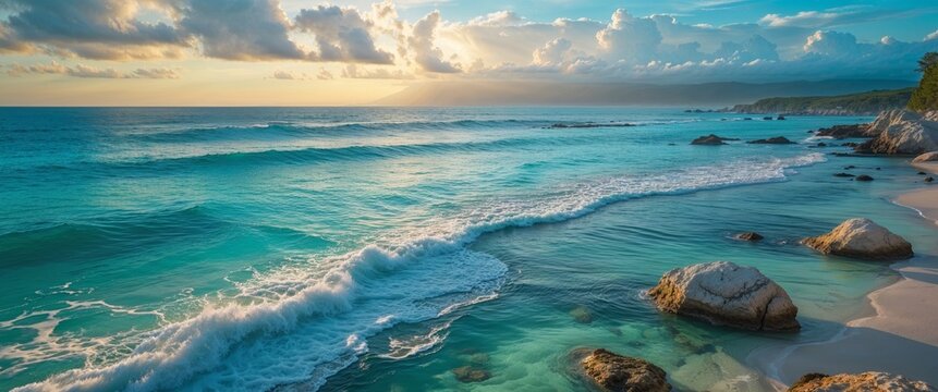 Tranquil coastal beach aerial view with rolling waves and copy space