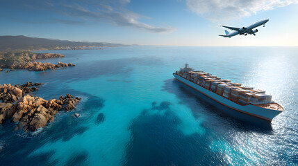 Global Logistics and Stunning Scenery: Container Ship and Airplane Above Turquoise Coastal Waters