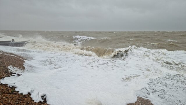 Storm Waves Crashing onto Pebble Beach Coastline during Rough Weather