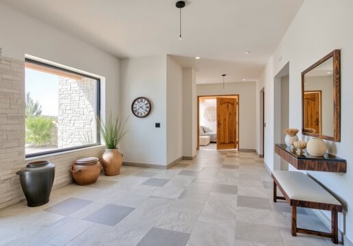 Coastal interior design of modern entrance hall with stone tiles wall and wooden rustic elements
