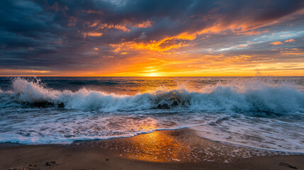 Dynamic ocean waves crashing onto the sandy shore under a dramatic sunset sky with vibrant orange and blue hues reflecting on the water's surface