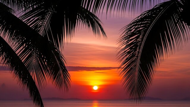 Tropical sunset with palm trees ocean.