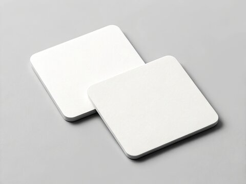 Two blank white square coasters on a gray background