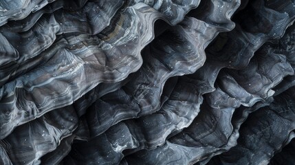 A tightly ruched fabric with waves of varying widths and depths resembling a rugged rocky coastline