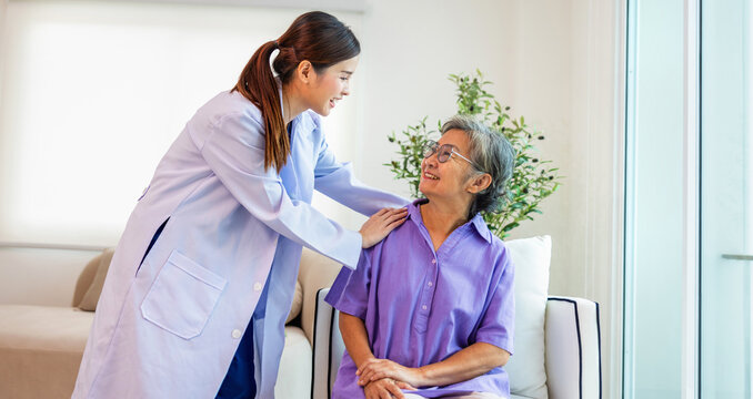 Caring female doctor consulting senior patient with copy space