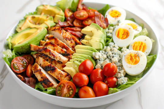 Delicious cobb salad featuring chicken, bacon, eggs, avocado, tomatoes, and blue cheese. Perfect for healthy eating concepts, lifestyle blogs,  summer promotions.
