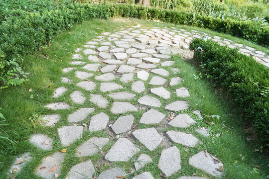 garden pavement - cobblestone and grass on sidewalk
