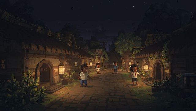 A winding, cobblestone path winds its way through a thick, lush forest The sky is a deep, brilliant blue, and the sun is setting in the distance
