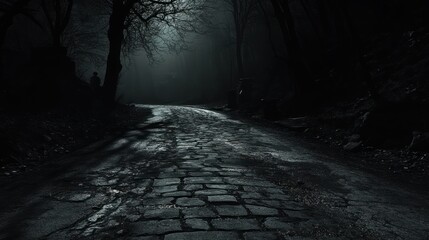 Foggy, cobblestone alley at night