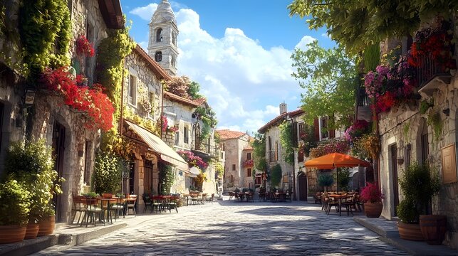 Charming European village square with cobblestone streets and cafes under a clear blue sky