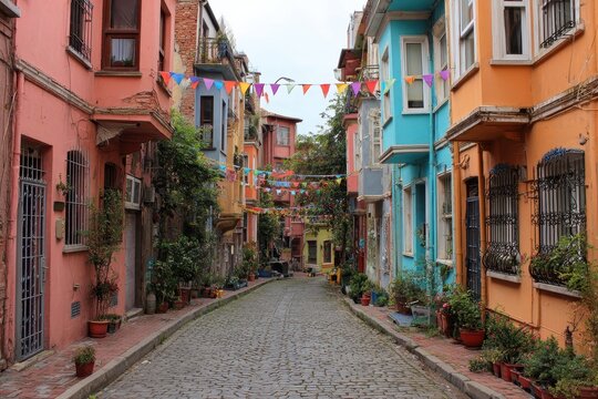 Colorful street, festive flags, cobblestone road, Istanbul, celebration