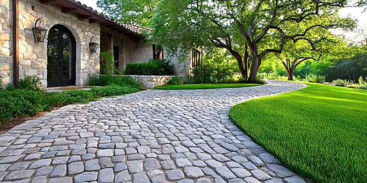 cobblestone walkway in front yard of house