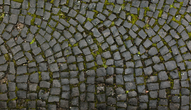 Glistening wet cobblestone alley reflecting light on damp narrow urban stone street